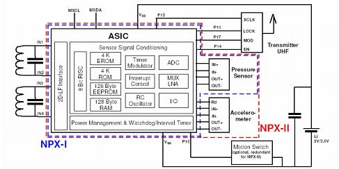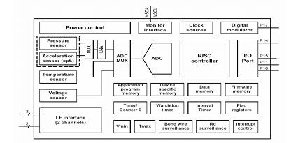 智能傳感器模塊還整合了ASIC/MCU,NPX2和SP30都是使用PHILPS的P2SC的傳感器信號調理的ASIC芯片(圖10、圖11),在NPX2的電原理圖中能清晰地看到這個單元,它包括一個作運算處理控制的8位RISC單片機、用于安置系統固化程序的4KEROM或FLASH、用于存放客戶應用程序的4KROM、用于存儲傳感器校準參數和用戶自定義數據的128ByteEEPROM、RAM、定時調制器、中斷控制器、RC振蕩器,以及將來自傳感器信號進行放大的低噪音放大器LNA、繼而將傳感器信號轉化為數字信號的ADC、與外界聯系的I/O口、電源管理和看門狗、斷續定時器、1-3維的LF接口。