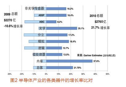 Gartner公司調查總監Stephan Ohr從宏觀上分析了MEMS的增長態勢。Gartner把MEMS分為光學和非光學兩大類。光學MEMS如TI公司的DLP(數字投影芯片)。非光學MEMS傳感器年增長率16.2%(圖2),2010年市場容量會突破30億美元,有望達到31億美元;2009年為28億美元。其中,汽車應用仍然保持非光學傳感器的第一位,占2009年總應用中的60%以上;但是數據處理和通信應用增長最快,數據處理包括硬盤的G-Force(重力)傳感器,通信中包括手機的可旋轉(rational)的傳感和基于位置的服務。