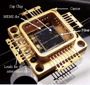 圖3微型光機械系統(tǒng)(MOEMS)交換器件的管芯被4條光纖和連接線連接,并封裝在工業(yè)標準的Covar金屬封裝內(nèi)