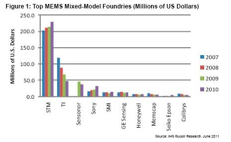 STM是一家由意大利和法國公司合并而成的公司,總部設在瑞士日內瓦。該公司2010年MEMS制造服務營業收入為2.286億美元,而美國德州儀器只有4740萬美元。圖1所示為IHS iSuppli公司的10大MEMS廠商排名,其生產的MEMS器件供自身使用或為他人代工。