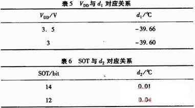 式中,d1和d2為特定系數。d1的取值與SHT11工作電壓有關,d2的取值則與SHT11內部A/D轉換器采用的分辨率有關,其對應關系分別如表5和表6所示。