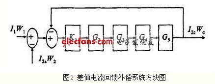 為了更清楚地表示一個自動控制系統中各組成環節間的相互影響和信號聯系,便于系統的分析研究,用方塊圖來表示控制系統的組成。差值電流回饋補償系統的方塊圖如圖2所示。圖2中,K2為檢測繞組的傳遞函數;G2為功放增益;G3為補償繞組傳遞函數;G4為電導增益;G5為補償繞組增益。