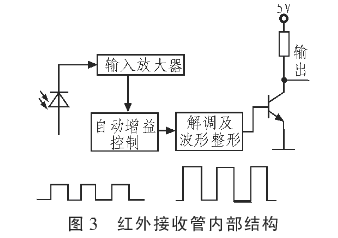 紅外線接收管內部電路如圖3所示,紅外線接收二極管內部電路將導通后微弱脈沖信號放大、濾波整形,輸出單片機可以識別的方波脈沖信號。該類型紅外線接收管導通波長范圍約為850~1 050 nm,紅外線發射管發射波長約為875 nm,能夠滿足紅外線接收管導通要求。