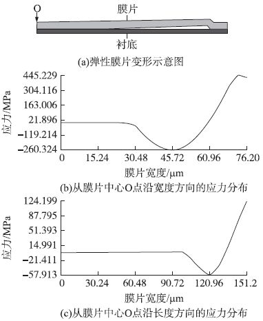 犧牲層厚度H2 < 1.6 μm 時,隨著犧牲層厚度的減小,使膜片與襯底剛好接觸所加載的壓力也隨之減小,當(dāng)犧牲層厚度減小使該加載壓力減小到剛好滿量程壓力時,犧牲層厚度不可再減小,否則傳感器在量程范圍內(nèi)將出現(xiàn)了非線性形變,這樣便確定了減小犧牲層厚度提高過載能力的極限值。經(jīng)過仿真,膜片長度a = 300 μm、寬度b = 150 μm、膜片厚度H1 = 3 μm 時,對應(yīng)的犧牲層厚度最小值為0.3μm。下面利用有限元分析軟件對此參數(shù)的壓力傳感器進(jìn)行非線性接觸分析。按照模型建立、網(wǎng)格劃分、接觸對建立、加載、求解的順序進(jìn)行模擬仿真。當(dāng)最大應(yīng)力達(dá)到硅的斷裂強度時,加載壓力為1.55MPa,仿真結(jié)果如圖4 所示,其中點O 處于膜片中心。