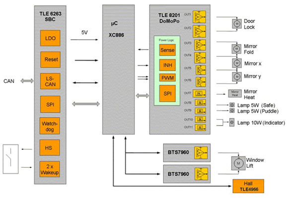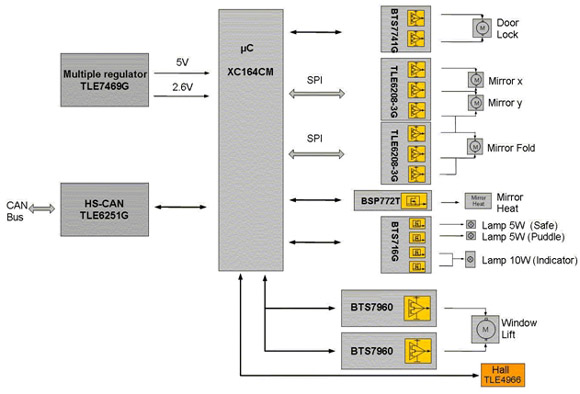 TLE8201R的另外一個重要特性是嵌入式標準串行外設接口(SPI)。SPI不僅可以節省微控制器的I/O管腳數量,而且能夠靈活控制功率電路,通過錯誤標志快速進行詳細的故障診斷。這種診斷功能包括對每個單獨通道進行過載或負載開路檢測,對整個器件進行溫度預警及電流檢測輸出。還有各種保護功能,如短路和過溫保護。兩個直接PWM通道可以用來實現諸如“軟”啟動/停止后視鏡加熱、車內照明的劇院燈光效果或在控制面板背光燈應用中補償LED亮度等級等功能。采用的DSO-36封裝包含了具有較低熱阻的全尺寸散熱片,可確保模塊在正常條件甚至最壞環境下正常工作。圖3是采用TLE8201R的一個車門模塊設計例子。