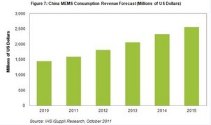 未來幾年,中國市場上增長最快的MEMS領域將是手機與消費市場的麥克風、加速計和陀螺儀。IHS公司預計,2015年該市場的MEMS銷售額將達到13億美元,2011-2015年復合年度增長率為21%。