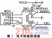 由于容柵傳感器內(nèi)部的專用控制芯片輸出的信號電壓為1.5 V,而后續(xù)數(shù)據(jù)采集系統(tǒng)工作電壓為5 V,要進行數(shù)據(jù)交換則必須進行電平轉(zhuǎn)換,電平轉(zhuǎn)換原理圖如圖1所示。電路中采用LM393芯片轉(zhuǎn)換電壓,LM393芯片實質(zhì)上為2個比較器,比較電壓為容柵傳感器工作電壓的一半左右,設(shè)為0.6V。通過比較電壓0.6V與CK和DATA信號線電平比較,即可將CK、DATA信號線的電壓轉(zhuǎn)換為0V或者5V。