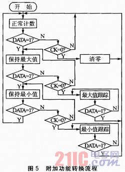 附加功能子程序包括正常計數(shù)、數(shù)據(jù)保持、最大值跟蹤、最小值跟蹤和清零的功能。對附加功能的實現(xiàn)均是通過控制CK和DATA信號線完成,附加功能轉(zhuǎn)換流程如圖5所示。給CK信號線一個負(fù)脈沖,即可完成清零操作;在正常計數(shù)狀態(tài)下將DATA信號線置為高電平,容柵傳感器將進入保數(shù)功能;如果再將CK信號線置為低電平,容柵傳感器進入最大值跟蹤功能;內(nèi)部專用芯片將用新測得的數(shù)據(jù)與上一個數(shù)據(jù)進行比較,如果新測得數(shù)據(jù)大,則替換掉,否則丟棄。可以在上位機上通過USB測試軟件發(fā)送相關(guān)命令來控制系統(tǒng)進行操作。程序中設(shè)定一個字節(jié)的變量來存放從上位機接收到的命令,當(dāng)判斷是其中的一個命令時就調(diào)用相應(yīng)的處理程序完成操作。