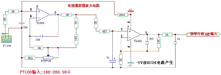 單片機(jī)的 10 位 A/D 在滿度量程下,最大顯示為 1023 字,為了得到 PT100 傳感器輸出電壓在顯示 500 字時的單片機(jī) A/D 轉(zhuǎn)換輸入電壓,必須對傳感器的原始輸出電壓進(jìn)行放大,計(jì)算公式為:(500/1023 * Vcc)/傳感器兩端電壓( mV/℃ ) ,(Vcc=系統(tǒng)供電=5V),可以得到放大倍數(shù)為 10.466 。