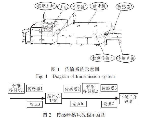 如傳感器流程示意圖1、圖2所示,假設(shè)一塊PCB的編號(hào)為01,首先從通過(guò)傳輸設(shè)備伸縮接駁機(jī)(編號(hào)為CS01)進(jìn)入設(shè)備貼片機(jī)(編號(hào)為T(mén)P01)進(jìn)行操作貼片流程,完畢之后再?gòu)馁N片機(jī)(編號(hào)為T(mén)P01)進(jìn)入傳輸設(shè)備接駁機(jī)(編號(hào)為CS02),再通過(guò)傳輸設(shè)備接駁機(jī)(編號(hào)為CS02)進(jìn)入下一個(gè)SMT生產(chǎn)設(shè)備,如此反復(fù)。