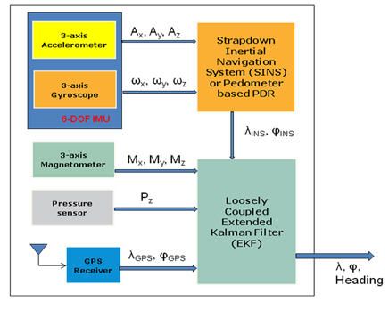 當(dāng)天線沒(méi)有被遮擋時(shí),現(xiàn)代的GPS接收器的絕對(duì)定位精度是3米到20米,這個(gè)參數(shù)不會(huì)在一段時(shí)期后發(fā)生漂移。基于MEMS傳感器的捷聯(lián)式慣性導(dǎo)航系統(tǒng)(SINS) 可在很短的時(shí)間內(nèi)提供精確的定位信息,但是,根據(jù)運(yùn)動(dòng)傳感器的性能,這種導(dǎo)航系統(tǒng)在使用一段時(shí)間后很快就會(huì)發(fā)生精度漂移現(xiàn)象。行人航位推算系統(tǒng)(PDR)是一個(gè)根據(jù)步長(zhǎng)和方位計(jì)算從室內(nèi)已知初始位置開(kāi)始的行走距離的相對(duì)導(dǎo)航系統(tǒng),雖然定位精度不會(huì)隨時(shí)間推移而發(fā)生漂移,但是需要在受磁力干擾的環(huán)境內(nèi)保持航向精度,此外,GPS需要對(duì)步長(zhǎng)進(jìn)行校準(zhǔn),才能達(dá)到可以接受的定位精度。