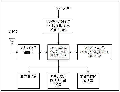•無(wú)線數(shù)據(jù)傳輸接口,包括GSM/GPRS、WiFi、藍(lán)牙和RFID:無(wú)線數(shù)據(jù)接口的主要目的是接入互聯(lián)網(wǎng),檢索當(dāng)前位置目標(biāo)的在線數(shù)據(jù)庫(kù),在等待GPS定位或沒(méi)有GPS信號(hào)時(shí)提供簡(jiǎn)要的定位信息。如果建筑物內(nèi)預(yù)裝了發(fā)射器,其它的近距離無(wú)線連接如WLAN、藍(lán)牙和RFID也可以提供精度適當(dāng)?shù)氖覂?nèi)定位信息。