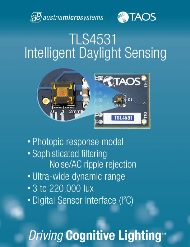 新的傳感器系列由2011年被奧地利微電子收購的全球領先智能照明傳感器提供商TAOS所研發,可提供從3勒克斯至220,000勒克斯的動態范圍,可防止直射陽光下的傳感器輸出飽和,并通過運用適光反應模型使傳感器的輸出與人眼的感知一致。