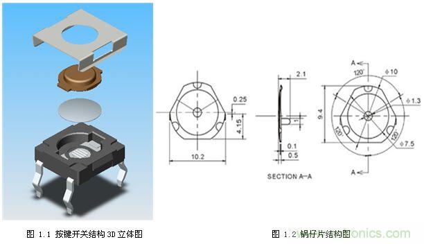 開(kāi)關(guān)分為輕觸開(kāi)關(guān)、滑動(dòng)開(kāi)關(guān)、多向開(kāi)關(guān)、按鍵開(kāi)關(guān)、感應(yīng)開(kāi)關(guān)、撥碼開(kāi)關(guān)等,種類異常繁多,在各個(gè)領(lǐng)域里各施其職。本文主要討論的是針對(duì)按鍵開(kāi)關(guān)的荷重位移曲線儀,所以下面重點(diǎn)說(shuō)說(shuō)按鍵開(kāi)關(guān)的結(jié)構(gòu)原理。如圖1.1按鍵開(kāi)關(guān)結(jié)構(gòu)3D立體圖所示,從上到下的構(gòu)件分別為:第一個(gè)是金屬固定架,材質(zhì)一般為不銹鋼,作用是固定好按鍵帽與圓形金屬?gòu)椘ㄒ步绣佔(zhàn)衅坏诙€(gè)是按鍵帽,材質(zhì)一般為塑料,作用是方便按鍵動(dòng)作的操作,只需在上面一按開(kāi)關(guān)即可閉合;第三個(gè)是按鍵開(kāi)關(guān)結(jié)構(gòu)里面最重要的構(gòu)件,叫金屬?gòu)椘ㄒ步绣佔(zhàn)衅粋€(gè)按鍵使用的壽命的長(zhǎng)短和質(zhì)量的好壞都與鍋?zhàn)衅兄苯雨P(guān)系,目前的金屬?gòu)椘鶕?jù)其形狀主要分為四大類:圓形、十字形/四角、三角形和腰圓/橢圓,直徑從3mm,4mm,5mm等常規(guī),同時(shí)也有各種特殊規(guī)格如十字形7mm、14mm、20mm等,力度從80克到500克。圖1.2所示的是三角形鍋?zhàn)衅慕Y(jié)構(gòu)圖。圓形鍋?zhàn)衅ń饘購(gòu)椘┦亲钇毡榈膹椘_(kāi)關(guān),按通用材質(zhì)分為兩種:不銹鋼(SUS301/SUS304)和磷青銅(單面附銀)。目前最小可以做到3MM,最大可以做到12MM,其他常用直徑為:3mm-12mm。力度可做到80G-500G。因其結(jié)構(gòu)較為規(guī)則,產(chǎn)品在沖壓過(guò)程中受破壞性比較小,因此壽命能夠達(dá)到較為理想狀態(tài)(100萬(wàn)次)。