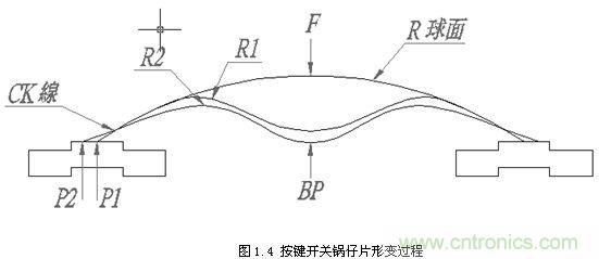 彈片自由狀態(tài)時(shí),支撐點(diǎn)為P1,當(dāng)外力“F”開(kāi)始向下施力時(shí),彈片開(kāi)始變形及位移,此時(shí)開(kāi)始產(chǎn)生曲線。在以P1為支撐點(diǎn)時(shí),外力“F”造成彈片變形,會(huì)產(chǎn)生最小的R1,此時(shí)的外力“F”即為彈片的OF值。過(guò)了彈片OF值位置時(shí),支撐點(diǎn)P1會(huì)開(kāi)始向P2位移,只要P1一位移,則R1又會(huì)變大,造成OF值變小,此時(shí)曲線即產(chǎn)生向下曲線(CK)。當(dāng)達(dá)到P2時(shí),即為P2支撐之最大R2,此時(shí)即達(dá)到彈片的BP點(diǎn)(最小OD點(diǎn))。若此時(shí)外力“F”繼續(xù)施力,則曲線又會(huì)向上產(chǎn)生曲線,上述過(guò)程如圖1.4所示。