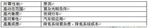 考慮到夜間行車,有些道路沒有路燈或者路燈很暗,汽車視覺系統(tǒng)也需要在低光照場景下采集路況信息。針對汽車應用,圖像傳感器需要滿足一系列汽車級要求,如寬溫度范圍、高可靠性、高集成度、低成本等。表1總結(jié)了汽車視覺系統(tǒng)中圖像傳感器應該具有的性能: