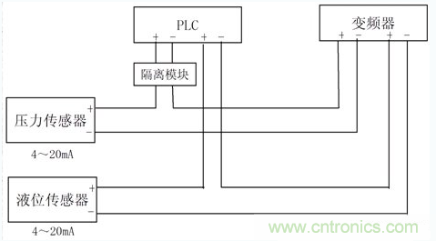 對(duì)于傳感器輸出的電流信號(hào),只經(jīng)PLC和變頻器的輸入阻抗之和不大于傳感器的輸出負(fù)載阻抗即可,壓力傳感器的信號(hào)可以同時(shí)串入PLC和變頻器,如只有壓力傳感器信號(hào),則PLC和變頻器也都可以正常接收壓力傳感器的信號(hào)。而當(dāng)液位傳感器的信號(hào)也同時(shí)接入PLC和變頻器時(shí),因PLC接收信號(hào)的-端都在變頻器的+端,當(dāng)兩傳感器的信號(hào)電流不一樣時(shí),就有可能使PLC兩-端的電位有較大的差異,就就形成了共模干擾電壓。如PLC輸入端又互相不是隔離的,則會(huì)造成PLC的模擬信號(hào)輸入端接收不正常。變頻器的兩輸入信號(hào)是在PLC的后面,其-端電位可保持在變頻器內(nèi)部電路設(shè)定的狀態(tài),問(wèn)題不大。
