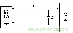 傳感器到PLC(或其它控制器)去的弱電信號(hào),可采用阻容濾波的方法減少干擾,如下圖所示。