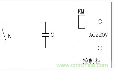 由于開關(guān)K離接觸器KM較遠(yuǎn),兩根電線很長(zhǎng)導(dǎo)致其分布電容C將變得很大,在交流電路中,這個(gè)分布電容中將有位移電流流過(guò),即使開關(guān)K斷開也可能因KM維持能量不需太大而導(dǎo)致KM不釋放,設(shè)備停不下來(lái),此時(shí),可以按以下方法解決: