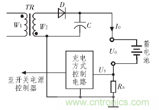 為了提高開關(guān)電源工作的可靠性,防止輸出電流過流等情況發(fā)生,許多開關(guān)電源在輸出端接入電流傳感器,檢測輸出電流的大小,一旦輸出電流超過設(shè)計(jì)標(biāo)準(zhǔn),保護(hù)電路即采取必要措施保護(hù)開關(guān)電源的安全[3]。此外,當(dāng)開關(guān)電源作為蓄電池充電器時,也需要檢測輸出電流的大小,以此了解蓄電池的充電情況,適時切換充電方式,達(dá)到提高充電效率,延長蓄電池的使用壽命的效果。圖3 為一個蓄電池充電器的輸出電流檢測原理圖, 電流檢測電阻RS將蓄電池的充電電流轉(zhuǎn)化為電壓US,反饋給充電方式控制電路,由控制電路根據(jù)充電電流的大小適時切換充電方式[4]。