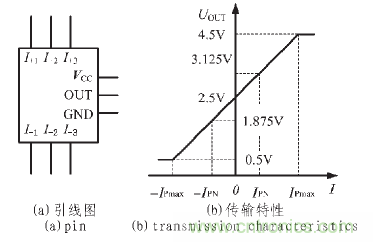 常用的TBC-DS 系列閉環(huán)霍爾電流傳感器的引線框圖和傳輸特性如圖5 所示[6]。圖5(a)所示的霍爾電流傳感器引線中,I+1~3和I-1~3是被測電流的串入繞組引腳, 其中,I+1和I-1是一個被測電流繞組的引腳,I+2和I-2、I+3和I-3也分別各是一個被測電流繞組的引腳。當(dāng)3 個被測電流繞組并聯(lián)時,霍爾電流傳感器的額定測量電流為IPN1; 若將兩個繞組并聯(lián)再與一個繞組串聯(lián)時,霍爾電流傳感器的額定測量電流為IPN2;若將3 個繞組相互串聯(lián)時,霍爾電流傳感器的額定測量電流為IPN3。3 個額定測量電流間的關(guān)系為:IPN1=2 IPN2=3 IPN3。可見,通過3 組被測電流繞組的不同接法,可以改變霍爾電流傳感器的額定測量電流值,擴(kuò)展測量區(qū)間。VCC為電源引腳,電源電壓通常為5 V;GND 是電源和傳感器輸出電壓的地;OUT 是傳感器電壓輸出引腳。由5(b)所示的霍爾電流傳感器傳輸特性可見,當(dāng)被測電流為0 時,其輸出電壓UOUT =2.5 V;當(dāng)被測電流不為0 且方向?yàn)閺腎+至I-時,輸出電壓UOUT>2.5 V,當(dāng)被測電流不為0 且方向?yàn)閺腎-至I+時,輸出電壓UOUT<2.5 V。IPN和-IPN是霍爾傳感器的正負(fù)額定電流, 當(dāng)被檢測電流達(dá)到額定電流時,根據(jù)電流方向的不同,輸出電壓UOUT 的值分別為3.125 V 或1.875 V, 即相對于2.5 V 的中心值有±0.625 V的偏移。當(dāng)被檢測電流值絕對值大于IPN 時,霍爾傳感器仍可輸出與被檢測電流成線性關(guān)系的電壓值,直至被檢測電流達(dá)到霍爾傳感器的最大檢測電流IPmax。通常,IPmax>3 IPN。