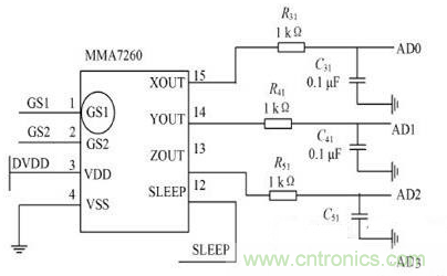 本無線采集系統采用了Freescale 公司最新推出的一款低成本、單芯片、三軸加速度傳感器MMA7260.該微型電容式加速傳感器融合了信號調理、單極低通濾波器和溫度補償技術,提供了4 種加速度測量范圍,分別為±1.5 g , ±2 g , ±4 g 和±6 g.考慮到前文將閾值定為0.2 g ,故設置參數將測量范圍定為±1.5 g.在CC1010 與MMA7260 的接口中,首先要考慮噪聲問題。因為MMA7260 內部采用了開關電容濾波器, 有時鐘噪聲產生, 所以需要在MMA7260 的XOU T ,YOU T 和ZOU T 三個輸出端分別接RC 濾波器;其次要考慮電壓匹配問題,由于x , y , z 軸方向的電壓輸出是0.45~2.85 V ,CC1010 的ADC 最大輸入范圍是0~V DD .此處,V DD = 3.3 V ,其范圍恰好在ADC的輸入范圍之內, 所以不用考慮額外的分壓電阻。CC1010 和MMA7260 的接口電路如圖3 所示。R31 / C31 , R41 / C41 , R51 / C51 用于濾除MMA7260 內部采樣的開關噪聲,GS1 ,GS2 用于量程選擇。
