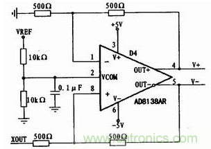 如圖3所示,差分轉換電路以AD8138AR為核心,將單端信號轉換差分信號,既可以提高共 模抑制比,有效減小共模信號影響,又可以驅動SOC內(nèi)部的24位差分Sigma-Delta模/數(shù)轉換器。AD8138AR具有較寬的模擬帶寬(320 MHz,-3 dB。增益為1時),而且AD8138AR為表面封裝器件,器件體積小,使得ADC與信號輸入點的距離可以很近,大大減少了外界噪聲的影響。