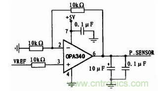 圖5中的輸入為圖4中的參考電壓(VREF)輸出。以低漂移、高穩(wěn)定性運放OPA340組成的運放電路給傾角傳感器SCA100T提供電源,能保證電源紋波小,工作穩(wěn)定。
