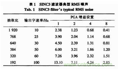 C8051F350內(nèi)部有具有2個獨立的抽取濾波器(SINC3濾波器和快速濾波器)和1個可編程增益放大器。根據(jù)參考文獻SINC3濾波器RMS噪聲小,精度高,缺點是輸出速率較低,而快速濾波器則相反。本設計對速率要求低,而對精度要求高,因此選用SINC3濾波器。SINC3濾波器典型RMS噪聲如表1所示。