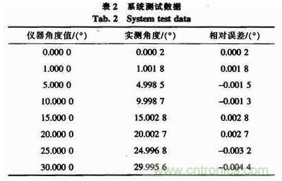 從表2的測試數(shù)據(jù)可知,每個測試點的偏差有正有負,其主要原因在于這些測試點的曲線擬合是獨立的,互不影響。另外,在30°時絕對誤差最大,最大的絕對誤差為0.0044°,在1°時相對誤差最大,為0.001 8/1≈0.018%。