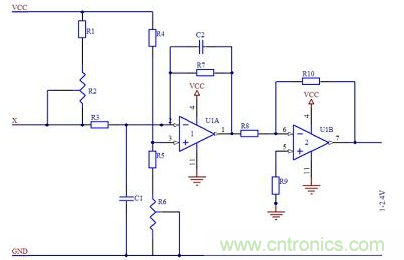 信號調理電路中還設計濾波電路,是為了濾去測量現場的干擾,例如電氣干擾、電磁干擾,使系統的信噪比增加。如圖2所示,電阻R2和電容C1組成簡單的無源RC低通濾波器。電阻R3、R7,電容C2及運放組成一階反相輸入RC有源低通濾波器,有源濾波器比無源濾波器具有更優越的性能,提高了頻率特性值,改善了選擇性。