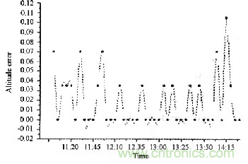 圖6和圖7給出了太陽高度角和方位角的誤差曲線。由曲線看出,采用基于圖像傳感器的太陽自動跟蹤控制器后絕對誤差較小且保持相對穩定。通過對實測數據的分析表明:在該系統中,高度角跟蹤絕對誤差小于0.12°,方位角跟蹤絕對誤差小于0.08°,采用圖像傳感器對太陽進行跟蹤后,得到了很高的精度,且可靠性提高。
