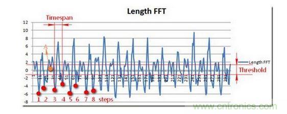 人體最快的跑步頻率為5HZ,也就是說相鄰兩步的時間間隔的至少大于0.2秒,如圖所示,我們設置了timespan在記步過程中我們過濾了高頻噪聲,即步頻過快的情況。同時我們通過和上次加速度大小進行比較,設置設立一定的閥值Threshold來判斷運動是否屬于有效,有效運動才可進行記步。