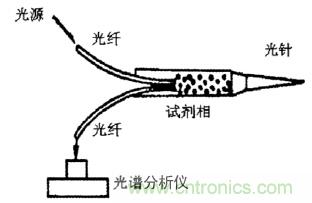 采用光傳感器測量 pH 值的原理,是利用透射光和發(fā)射光的強(qiáng)度隨波長分布光哭進(jìn)行測定的,在纖維素膜盒中插入兩條光纖,然后將針頭插入血管或者組織中,試劑會和體液混合,吸收特定波長的光,然后使用分析儀將測量這種變化,分析后即可得到組織或者血液的 pH 值。