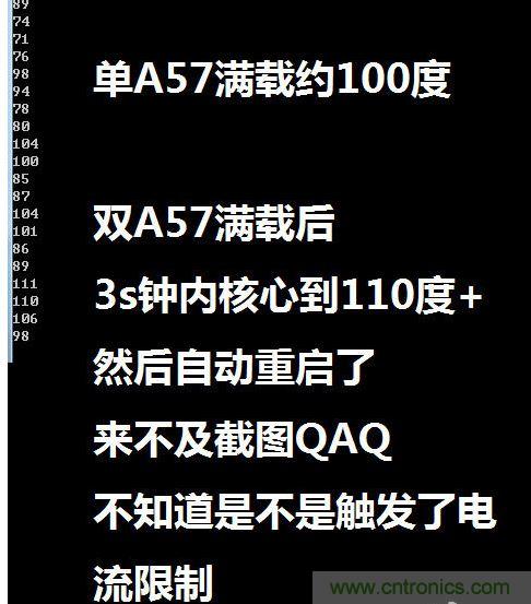 那么810的功耗有多高呢,根據貼吧大神(炮神)ioncannon的分析,在Z9 Max上,810的單核心功耗最高可以達到5W(注意是單核心!單核心!單核心! 重要的事情要說三遍),雙核A57同時滿載3S就發熱達到110攝氏度,并自動重啟了,想測試下雙核的功耗都以為爆機沒辦法測試了。