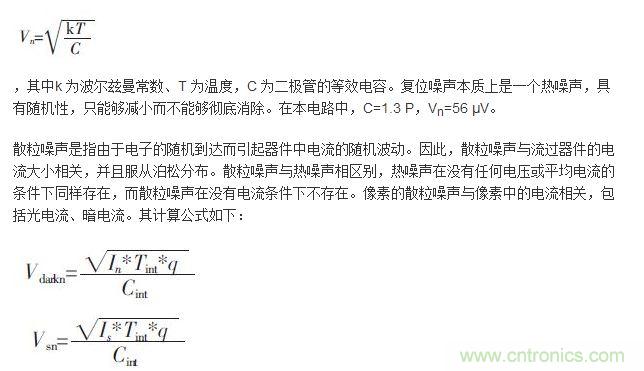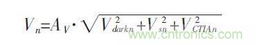 光電流散粒噪聲與照度有關,很難消除。與暗電流有關的散粒噪聲可以通過改變摻雜濃度減小暗電流,但這會降低量子效率。在本電路中,In=100 fA,Is=20 pA,Tint=20 μs,C int =2 fF,則Vdarkn=0.28 mV,Vsn=4 mV。