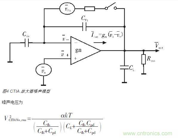 CTIA 讀出噪聲與輸入端電容Cin=Cpd、反饋電容Cfb,以及負載電容CL的設計均有關,其小信號噪聲模型如圖4 所示。