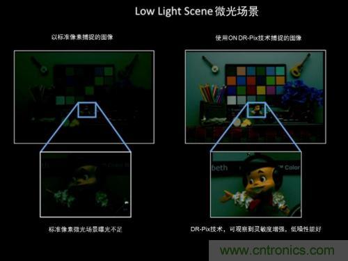 AR0130采用安森美半導體專有的A-pix像素技術進行減噪,以及DR-pix(動態響應)像素技術,以每秒60幀(fps)的速率捕獲高清720p視頻,優異的近紅外(NIR)性能以850納米波長提升夜視能力,微光(低至0.1勒克斯)高清成像的性能堪稱世界一流。如圖1所示,在相同的微光場景中,右圖由于使用了安森美半導體的DR-Pix技術,比左圖用一般相機所拍圖像的感光度和清晰度更好。