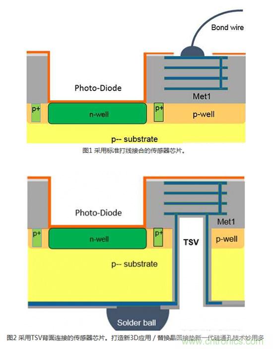 模擬3DIC技術(shù)通常是透過建造芯片正面到IC背面的電氣連接來實現(xiàn)傳感器應(yīng)用。 在許多傳感器應(yīng)用,例如光學(xué)、化學(xué)、氣體或壓力傳感器中,感測區(qū)域是位在CMOS側(cè)(晶圓的頂端)。 芯片和導(dǎo)線架之間最常用的連接是打線接合(Wire bonding)(圖1)。 無論是使用塑料封裝,或是將裸片直接接合在印刷電路(PCB)或軟性電路板上,對于某些會將感測區(qū)域暴露出來的應(yīng)用而言,打線接合并非理想的解決方案。 采用專業(yè)晶圓代工業(yè)者的專有TSV技術(shù),可以利用TSV、背面RDL和芯片級封裝(WLCSP)(圖2)來替代打線。