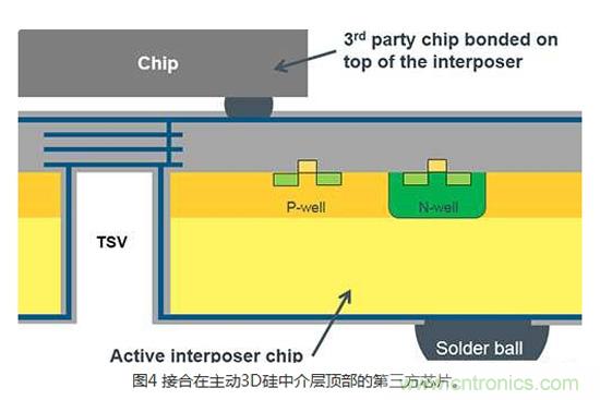 3DIC技術(shù)的另一個變化和極為創(chuàng)新的發(fā)展,是硅中介層架構(gòu)(Silicon interposer architecture)。 所謂的被動3D硅中介層是用來產(chǎn)生一個從芯片的頂端到底部的簡單電氣連接。 所謂的主動3D硅中介層能支持實現(xiàn)完整CMOS設(shè)計所需制程技術(shù)的所有被動和主動組件。