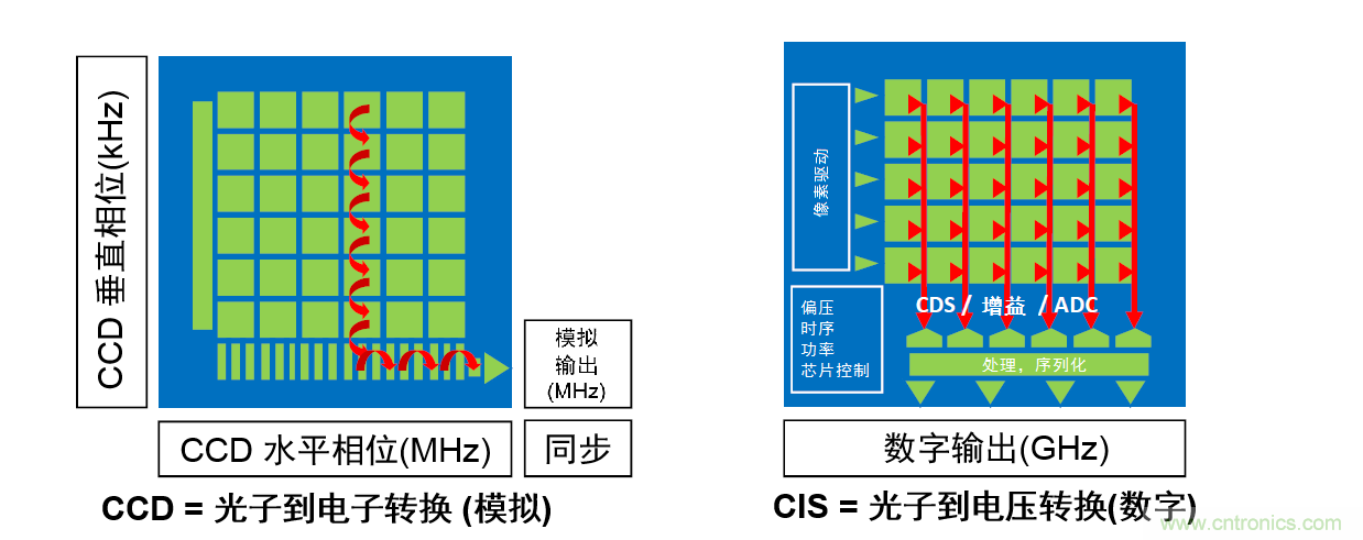 CMOS的擁有經改進的系統復雜性,因為它基本上是嵌入了如模數轉換、相關雙采樣(CDS)、時鐘生成、穩壓器等系統級芯片(System-On-Chip,SOC)結構,或是影像后處理等功能,而這些以前都是應用系統