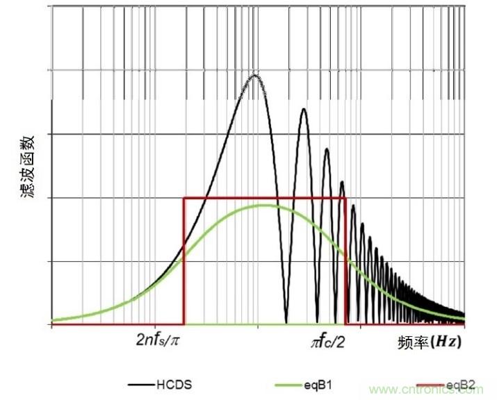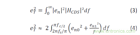 在算式中,fs 是采樣頻率, n是CDS 因子(通常n=2)。如圖3顯示,取決于采樣頻率,這一濾波或多或少地去除1/f噪聲頻率成分,尤其是當采樣頻率fs很高的時候 顯著(換句話說,電荷進出“陷阱”的動作將慢于CDS頻率)。HCDS濾波器結合放大鏈的低通濾波器可以簡化為一個如圖3所示的等效帶通濾波器。圖中的eqBP1 對應一個一級帶通濾波器。這裡eqBP1的噪聲頻譜函數要除以2,以得到一個帶有HCDS函數的等效集成噪聲功率 。eqBP2 是eqBP1的陷波估算值。要取得集成噪聲功率,eqBP2 的上限和下限分別按照下列算式進行倍增: