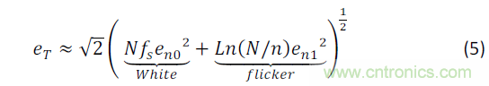 噪聲最由兩個因素造成:1/f閃爍噪聲和熱噪聲(見圖2)。閃爍噪聲是大自然中常有的噪聲,而它旳頻譜密度和地球自轉速度、海底水流、天氣以至氣候現象等活動相關。研究報告顯示普通蠟燭的閃爍速率是1/f 。在MOS器件和放大鏈各元素中,閃爍噪聲則是技術工藝誤差生成的缺陷,使電荷被困于柵極氧化物內所造成的結果。電荷進出這些“陷阱”,造成晶體管通道內的電流不穩定 [6],故又稱「隨機電報噪聲」(random telegraph noise,RTS)。利用洛倫茲數學模型(Lorentzian mathematical model) 可以形容每一個“陷阱”的共振行為,而模型的總和(即MOSFET通道表面范圍的所有“陷阱”總和)在1/f頻譜上展示時,會全完符合具體噪聲的頻譜密度。結果顯示,1/f波幅與MOSFET通道表面面積成反比──而不是完全直觀。