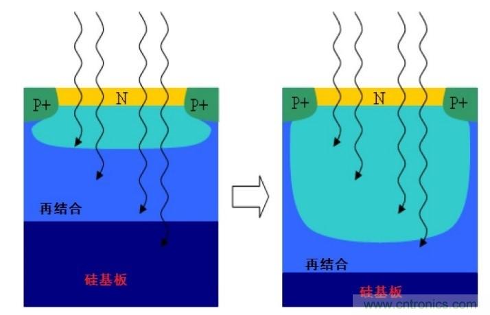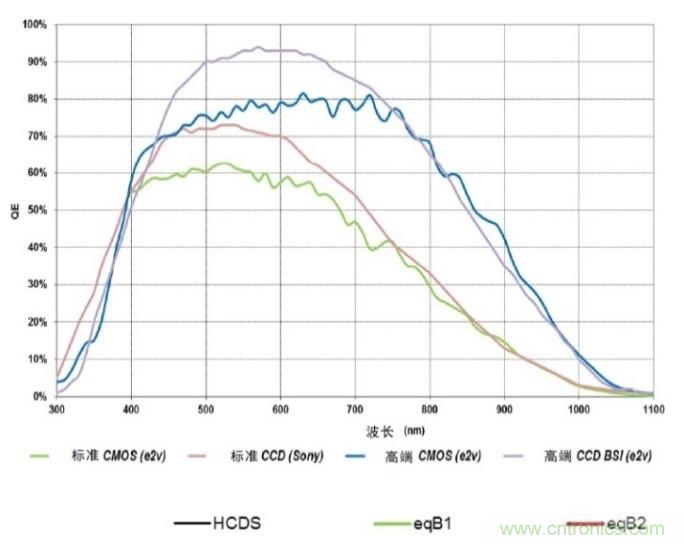 量子效率(Quantum efficiency ,QE) 是直接影響圖像傳感器光電性能的因素,因為光電轉換效率的任何損耗都會直接減低信噪比 (Signal-To-Noise- Ratio,SNR) 。它的影響是兩方面的,因為當散粒噪聲(信號的平方根)是主要噪聲源時,QE不單是信噪比的被除數(信號),同時也是除數(噪聲)。在這一點之上,CCD和CMOS處于同一水平,可是CCD在QE改進方面累積有多年的技術工藝優化,而在CIS的QE改進發展相對較遲。基于硅物質的物理特性,較長的波長能穿透光敏轉換地帶,所以會使用厚的外延材料來增加上紅色和近紅外線波長的QE。根據比爾朗伯定律(Beer-Lambert law),被吸收的能量是與介質的厚度成指數關係。高端應用的 CCD 利用較厚的硅物質和背照(back side illumination ,BSI)工藝以恢復高寬帶QE和近紅外線(near infrared ,NIR)敏感度,因而擁有優勢。