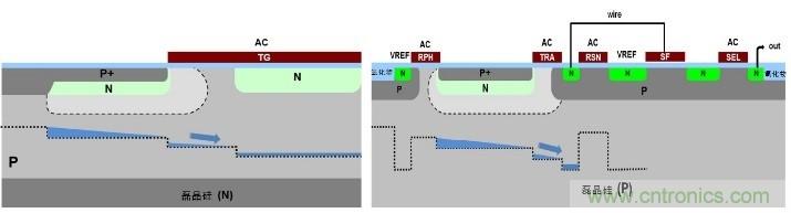 “嵌入式光電二極管” (pinned photodiode,PPD) 或“空穴堆積二極管”(hole accumulation diode,HAD) 最初開發目的是消除延遲并把全部電荷從光電二極管轉移到ITCCD寄存器[12]。CMOS圖像傳感器的一個重大發展是在2000年代初期引進ITCCD光電二極管結構[11],如圖7所示。在CMOS中,像素結構多數以每像素的晶體管數目來表示。大部分 CMOS圖像傳感器傾向使用電子卷簾快門(electronic rolling shutter),這有助于集成并只需少至三個晶體管 (3T)就能實現。雖然有結構簡單的優點,3T像素結構的缺點是電路來自kT/C (或溫度) 噪聲的像素生成時域噪聲會較大,而且不能輕易消除。
