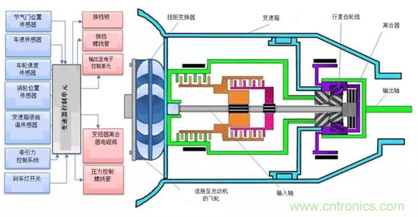 自動變速器汲取汽車發動機產生的功率,然后通過符合各種駕駛需求的不同的齒輪傳動比傳導這些功率。齒輪傳動比之所以不同,是為了確保發動機轉速(RPM)和供應給車輪的扭矩與當前車速和加速度匹配。來自發動機飛輪的動力通過扭矩變換器傳輸給變速器(見圖1)。
