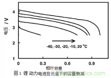 鋰動(dòng)力電池在不同低溫下的放電容量曲線如圖1所示,與室溫20℃相比,低溫-20℃下容量衰減已經(jīng)比較明顯,到-30℃是容量損失更多,-40℃下容量連一半都不到了。