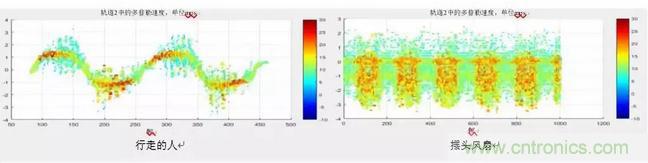 圖3:兩張圖顯示了行走的人和擺頭風扇隨時間推移的微多普勒信息