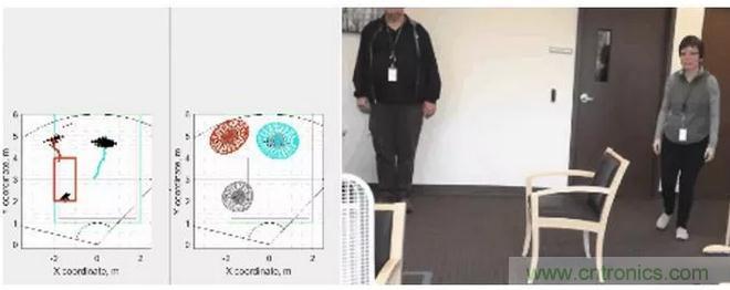 圖4:使用毫米波傳感器執行分類的示例:中間圖上所有移動目標都分配了一個軌道,彩色區域表示人
