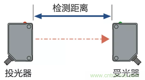 對射型光電傳感器:發射端和接收端之間的距離